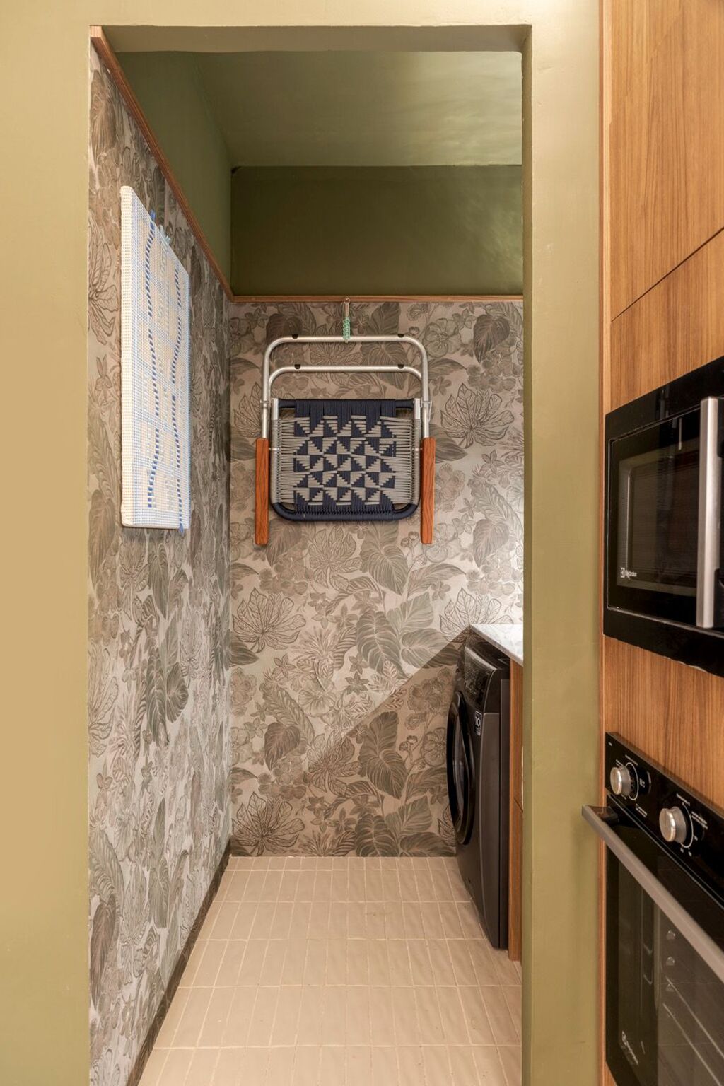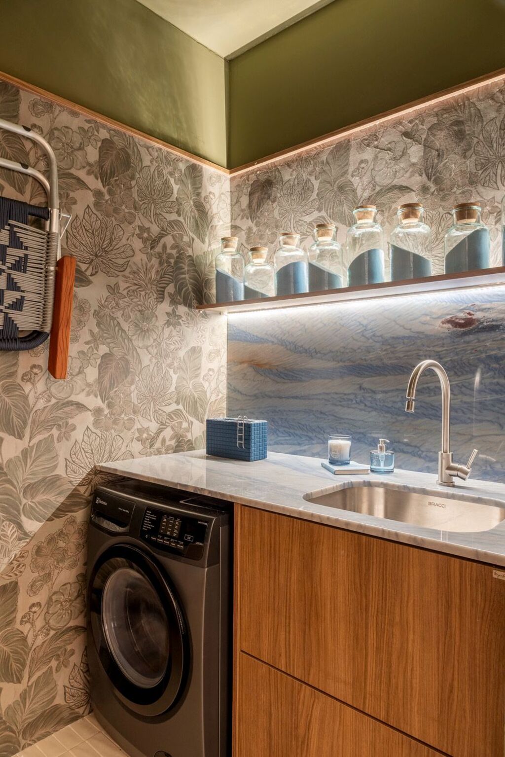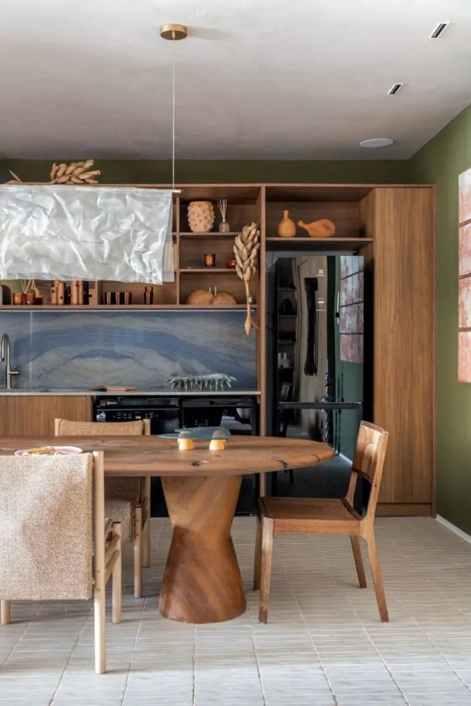 O partido arquitetônico se organiza a partir de dois eixos simbólicos. Na área social, tons de verde e azul se combinam a materiais naturais para estabelecer uma conexão direta com a paisagem carioca, evocando a proximidade entre floresta e mar. “Na Casa Corcovado, a área social é marcada pela presença simbólica da floresta e do mar, com predominância dessas tonalidades que remetem à paisagem do Rio”, afirma a arquiteta. A integração visual entre os ambientes e a circulação fluida reforçam a ideia de casa como lugar de convivência e de encontros descontraídos.