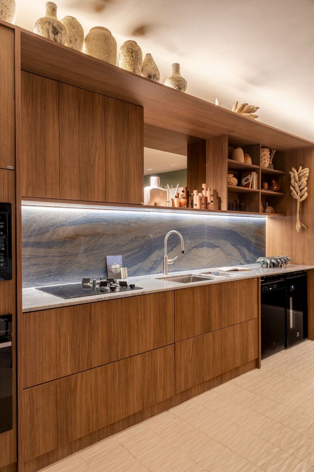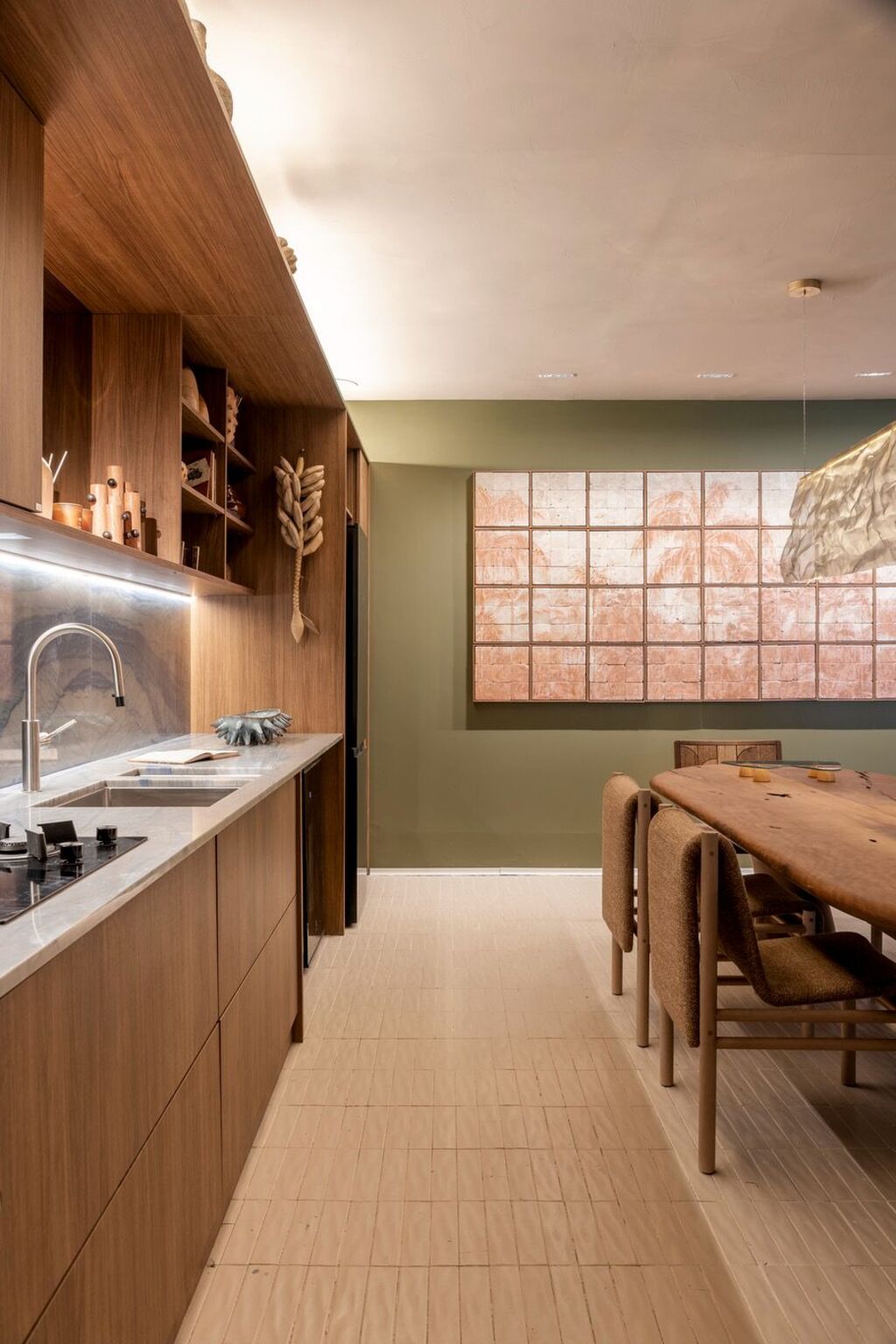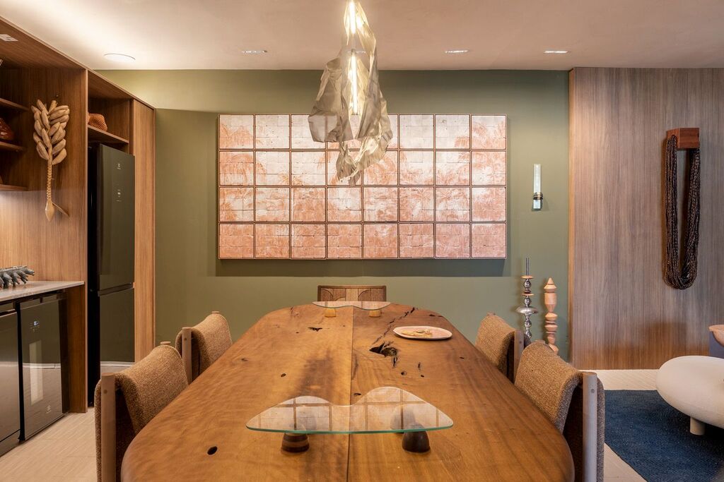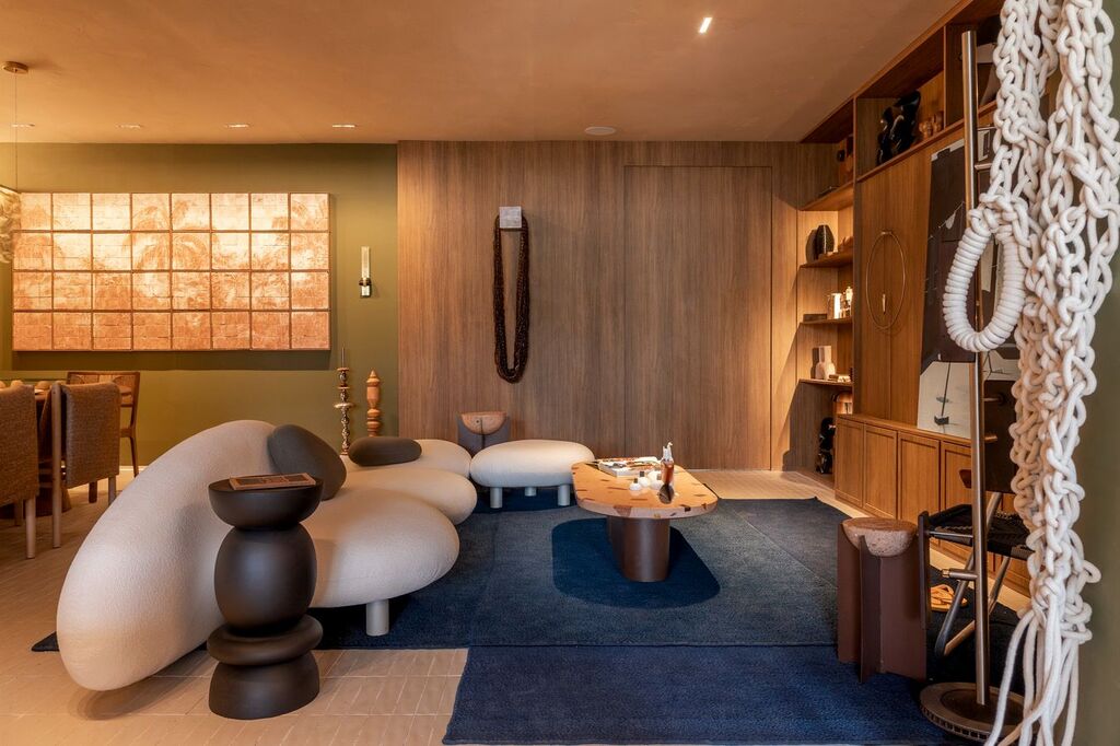 Concebido como uma homenagem a Laís e Vinícius, cariocas que hoje vivem fora da cidade natal, o ambiente parte da ideia de que a arquitetura pode aproximar pessoas e lugares por meio da memória e da sensibilidade espacial. Mais do que um espaço de contemplação, a Casa Corcovado foi pensada como cenário para a vida cotidiana — um lugar onde receber amigos, cozinhar, desacelerar e descansar acontecem de forma integrada. “O Rio tem uma maneira muito própria de ocupar a casa e de viver os espaços. A proposta foi traduzir essa leveza e essa relação com o encontro para um apartamento em São Paulo, criando um ambiente que evocasse pertencimento e memória”, explica Paula Martins.