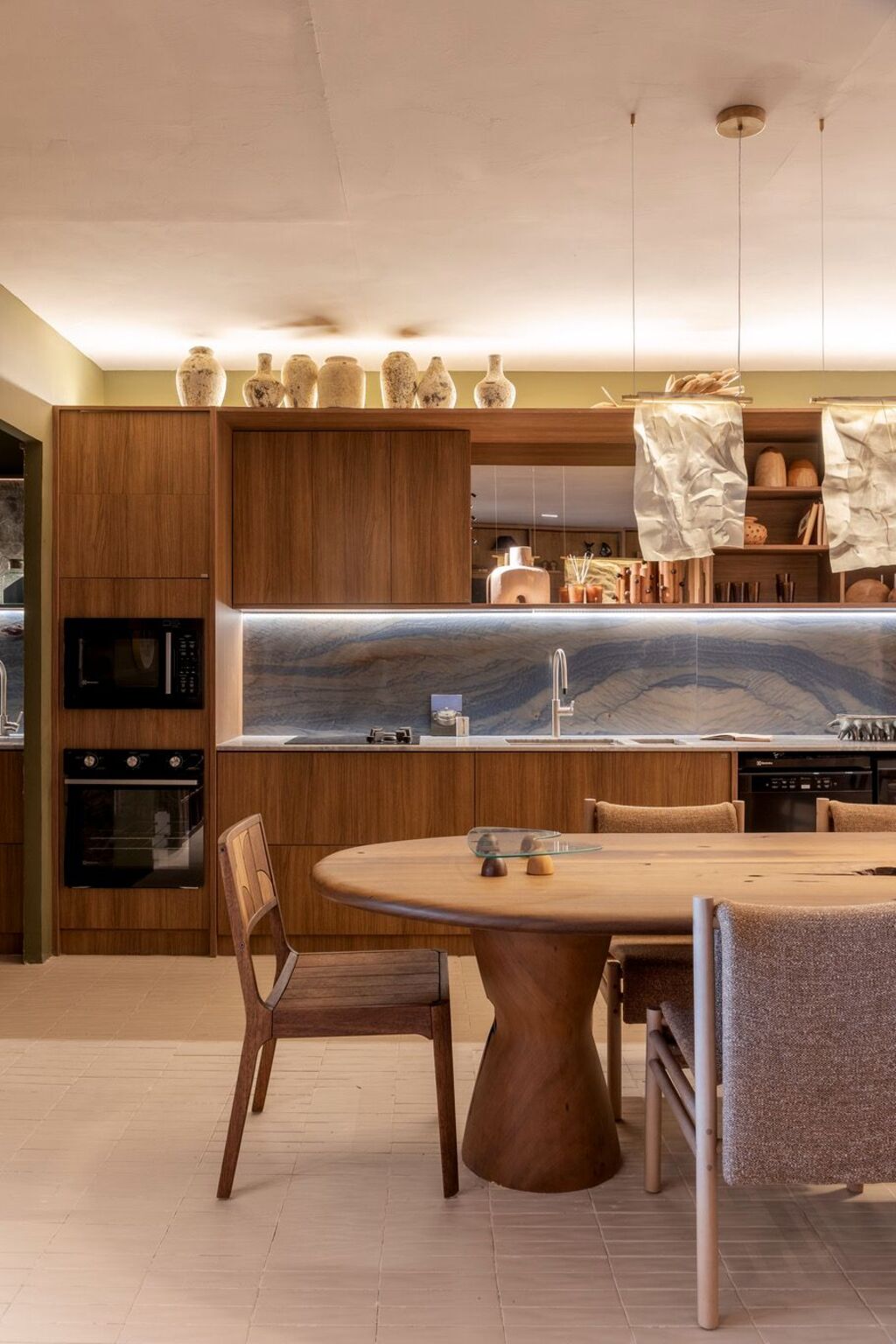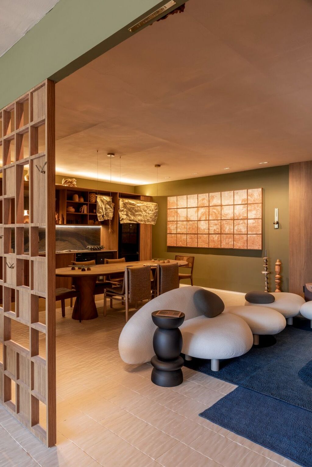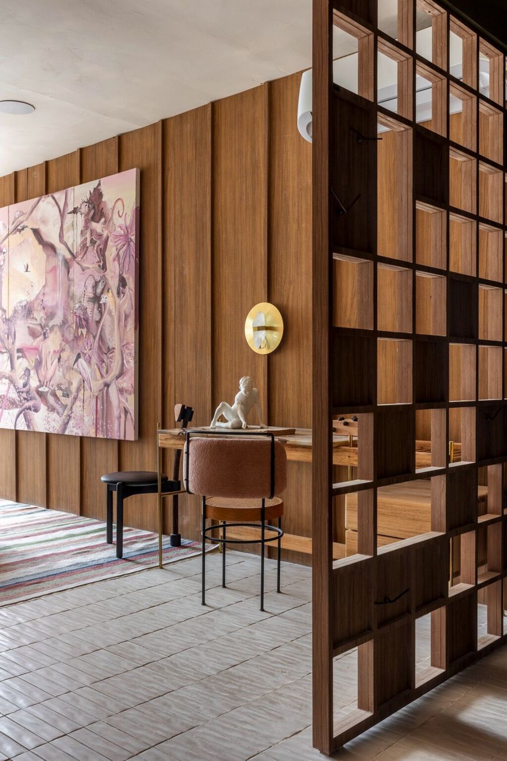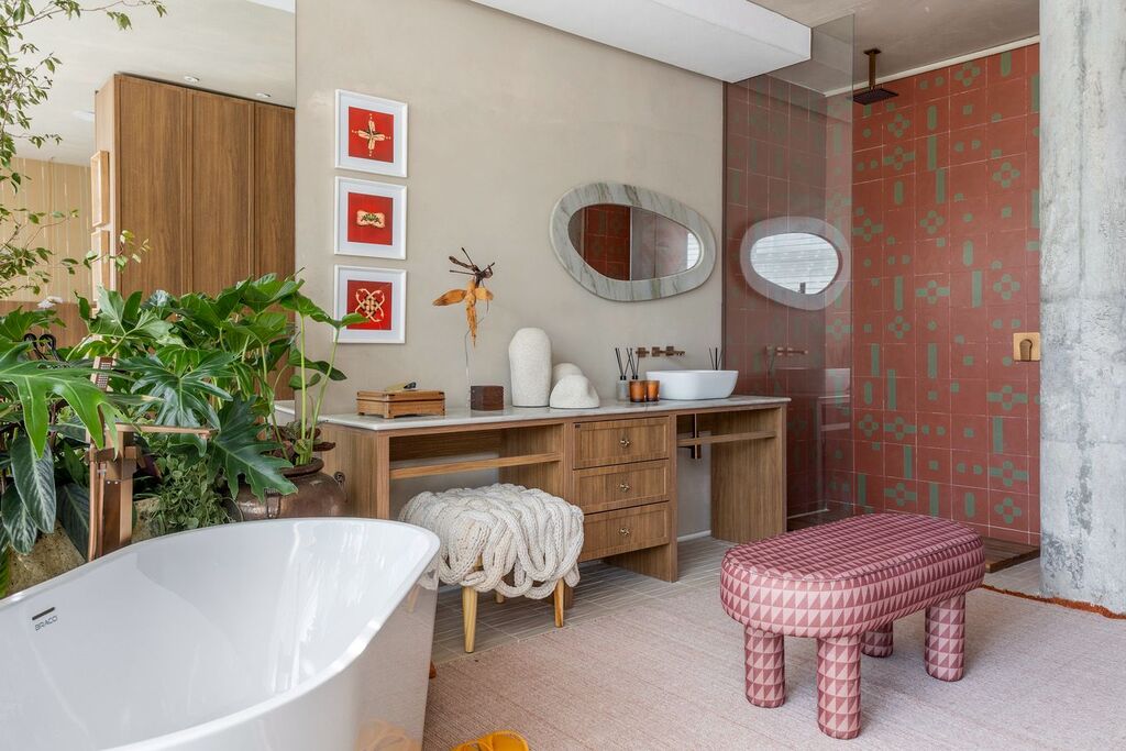 Estampas e texturas também se espalham pelo ambiente no mobiliário, tapetes, papéis de parede, almofadas e revestimentos, trazendo movimento e vitalidade à composição.