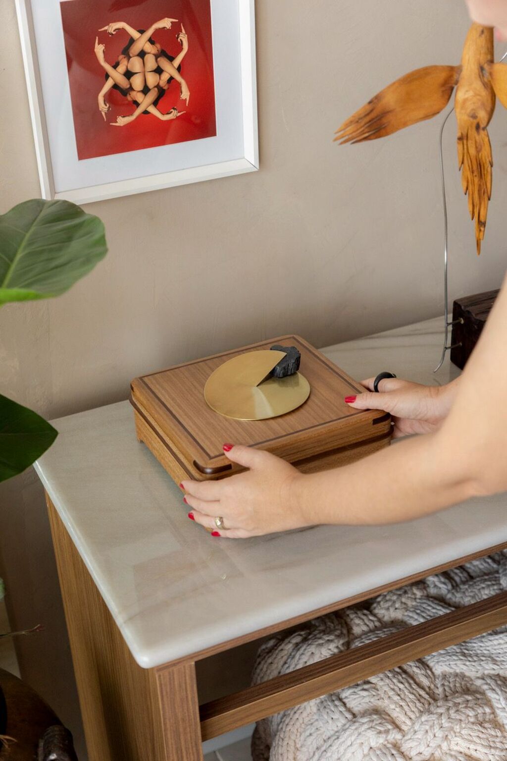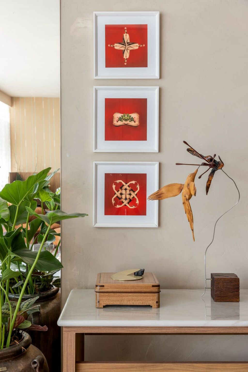 A curadoria de arte e objetos, assinada por Belchior Almeida, também desempenha papel central no projeto. Uma grande estante organiza parte desse repertório e funciona como abrigo de histórias, memórias e coleções de objetos que reverenciam fé, contraste e beleza. Peças de diferentes épocas, materiais e estilos convivem de maneira intencional, refletindo a ideia de que identidade é uma construção contínua. A arte aparece como um dos pilares do espaço, presente em diferentes linguagens — da produção popular à contemporânea —, compondo, por meio da curadoria das obras, uma narrativa diversa e afetiva. “A curadoria organiza contrastes e aproxima linguagens para construir uma leitura do Rio que se revela no espaço”, comenta o curador.